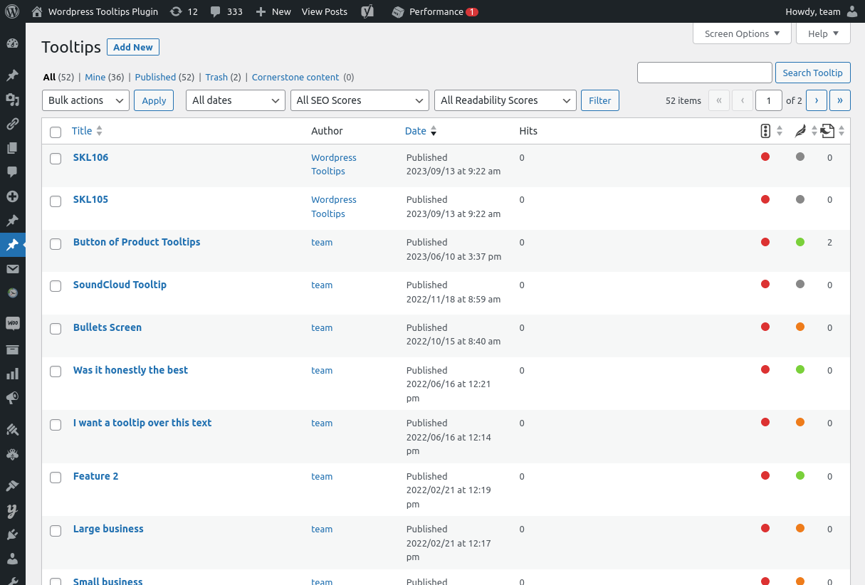 And as you can see after imported the csv file from wordpress tooltips plugin, in our tooltip list it looks like this:
